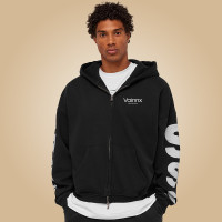 This black washed zip-up hoodie, featuring a roomy oversized silhouette, elevates casual looks when layered over a printed inner tee and paired with light beige pants—crafting a relaxed, textured street style perfect for daily outings.